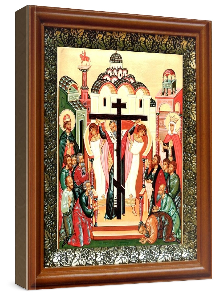 Икона воздвижение креста господня (19х22), светлый киот. Лик нанесен методом шелкографии на цельную липовую доску, покрытую левкасом (специальным грунтом под живопись). Использованы минеральные (природные) краски. Размер иконы без киота (см): 13х16, с киотом: 19х22. Киот со стеклом, выполнен из березы и украшен басмой (узор из черненой меди в виде виноградной лозы). Икона освящена.