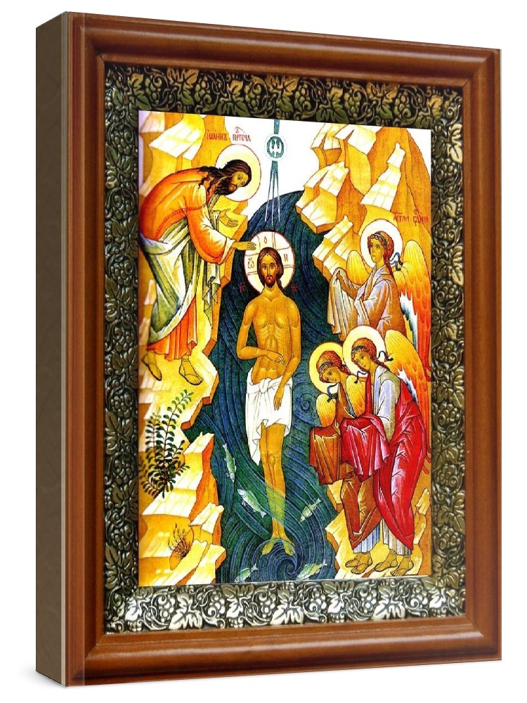 Икона крещение господне (19х22), светлый киот. Лик нанесен методом шелкографии на цельную липовую доску, покрытую левкасом (специальным грунтом под живопись). Использованы минеральные (природные) краски. Размер иконы без киота (см): 13х16, с киотом: 19х22. Киот со стеклом, выполнен из березы и украшен басмой (узор из черненой меди в виде виноградной лозы). Икона освящена.