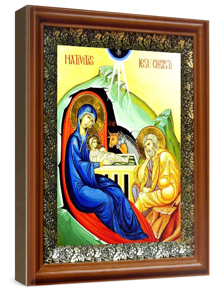 Икона рождество христово (19х22), светлый киот. Лик нанесен методом шелкографии на цельную липовую доску, покрытую левкасом (специальным грунтом под живопись). Использованы минеральные (природные) краски. Размер иконы без киота (см): 13х16, с киотом: 19х22. Киот со стеклом, выполнен из березы и украшен басмой (узор из черненой меди в виде виноградной лозы). Икона освящена.