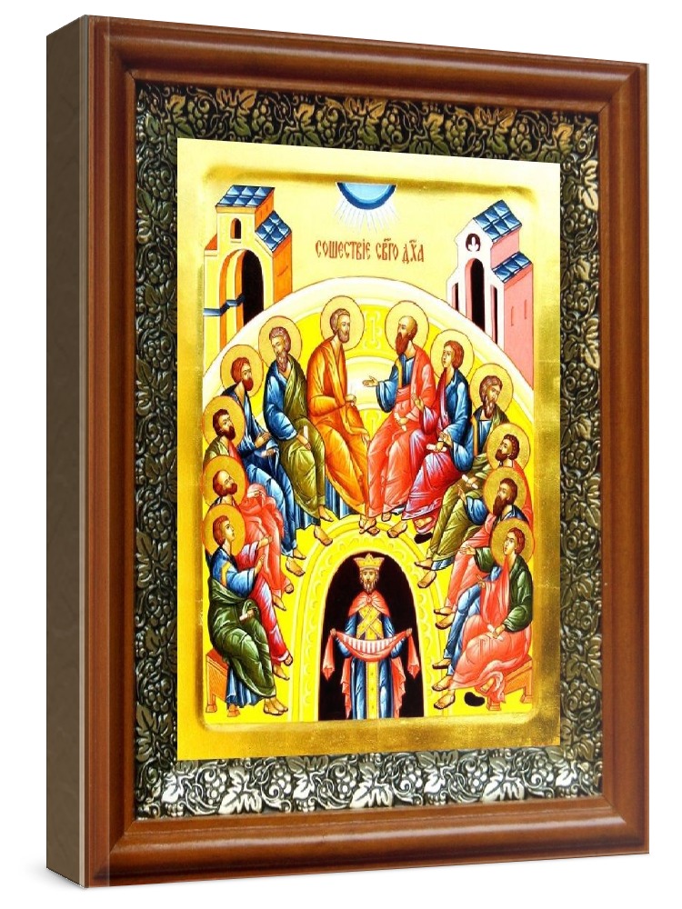 Икона сошествие святого духа на апостолов (19х22), светлый киот. Лик нанесен методом шелкографии на цельную липовую доску, покрытую левкасом (специальным грунтом под живопись). Использованы минеральные (природные) краски. Размер иконы без киота (см): 13х16, с киотом: 19х22. Киот со стеклом, выполнен из березы и украшен басмой (узор из черненой меди в виде виноградной лозы). Икона освящена.