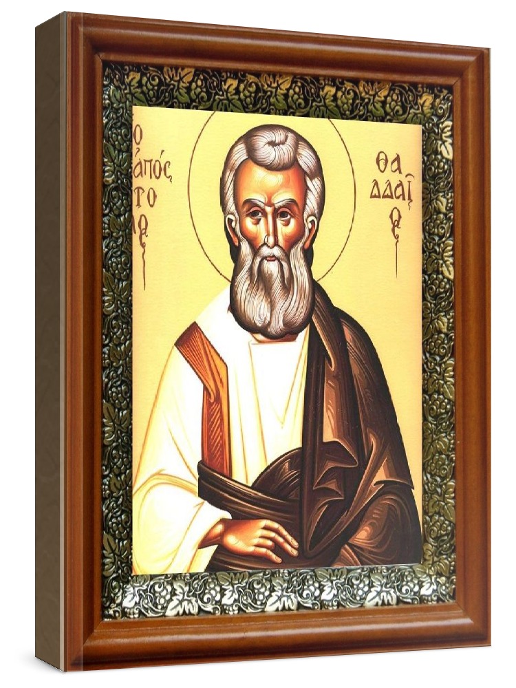 Икона фаддей, апостол от 70-ти (19х22), светлый киот. Лик нанесен методом шелкографии на цельную липовую доску, покрытую левкасом (специальным грунтом под живопись). Использованы минеральные (природные) краски. Размер иконы без киота (см): 13х16, с киотом: 19х22. Киот со стеклом, выполнен из березы и украшен басмой (узор из черненой меди в виде виноградной лозы). Икона освящена.