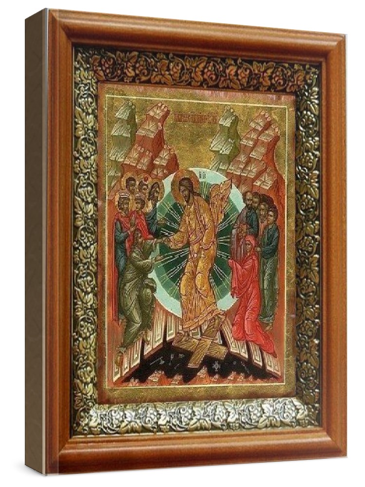 Икона воскресение христово (19х22), светлый киот. Лик нанесен методом объемного тиснения фолиевыми красками по золотой фольге, что гарантирует максимально долгую сохранность яркости изображения. Полный размер иконы с киотом: 19x22 см. Икона под стеклом. Киот (рамка) изготовлен из березы и украшен басмой (узор из черненой меди в виде виноградной лозы).