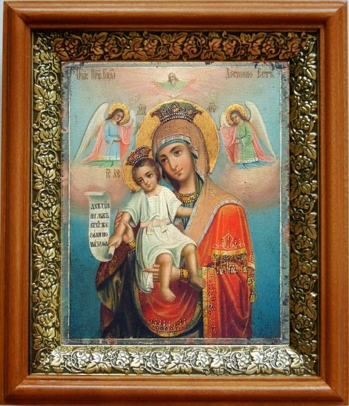 Икона достойно есть (19х22), светлый киот. Лик нанесен методом шелкографии на цельную липовую доску, покрытую левкасом (специальным грунтом под живопись). Использованы минеральные (природные) краски. Размер иконы без киота (см): 13х16, с киотом: 19х22. Киот (рамка) выполнен из березы и украшен басмой (узор из черненой меди в виде виноградной лозы). Икона освящена.