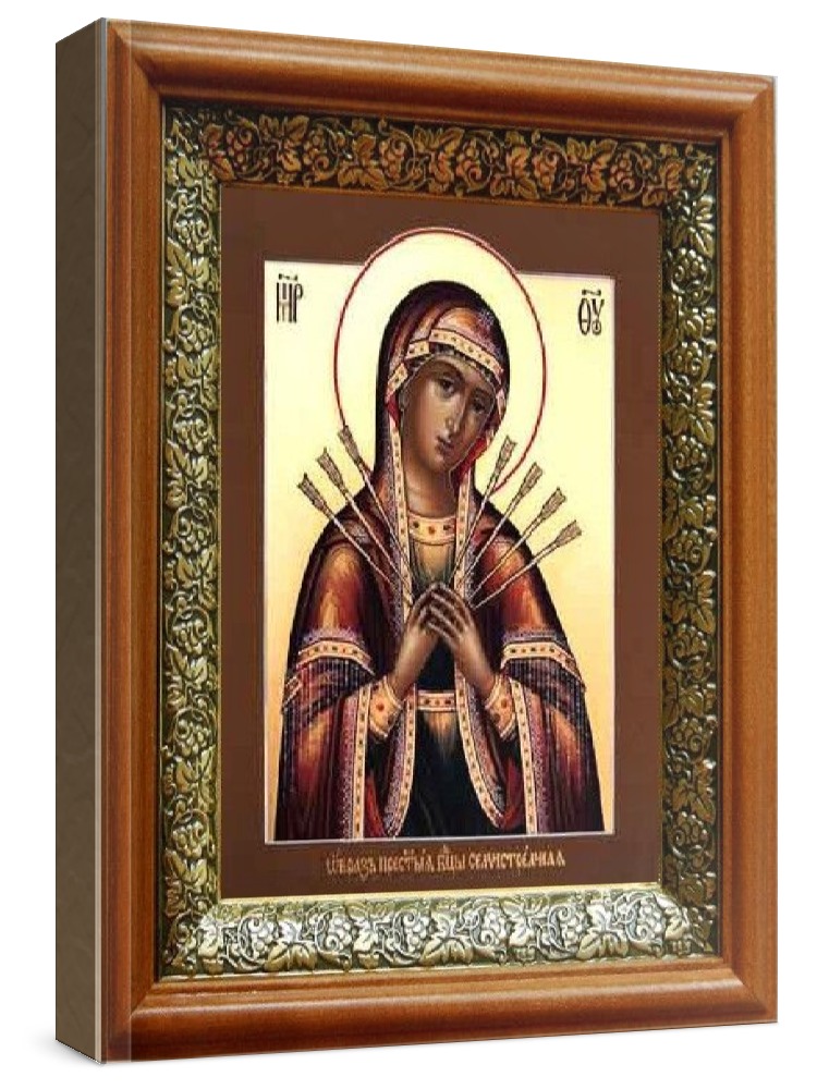 Семистрельная икона бм (19х22), светлый киот. Лик нанесен методом шелкографии на цельную липовую доску, покрытую левкасом (специальным грунтом под живопись). Использованы минеральные (природные) краски. Размер иконы без киота (см): 13х16, с киотом: 19х22. Киот (рамка) выполнен из березы и украшен басмой (узор из черненой меди в виде виноградной лозы). Икона освящена.
