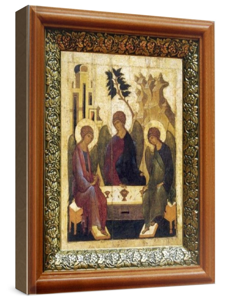 Икона троица (19х22), светлый киот. Лик нанесен методом шелкографии на цельную липовую доску, покрытую левкасом (специальным грунтом под живопись). Использованы минеральные (природные) краски. Размер иконы без киота (см): 13х16, с киотом: 19х22. Киот (рамка) выполнен из березы и украшен басмой (узор из черненой меди в виде виноградной лозы). Икона освящена.