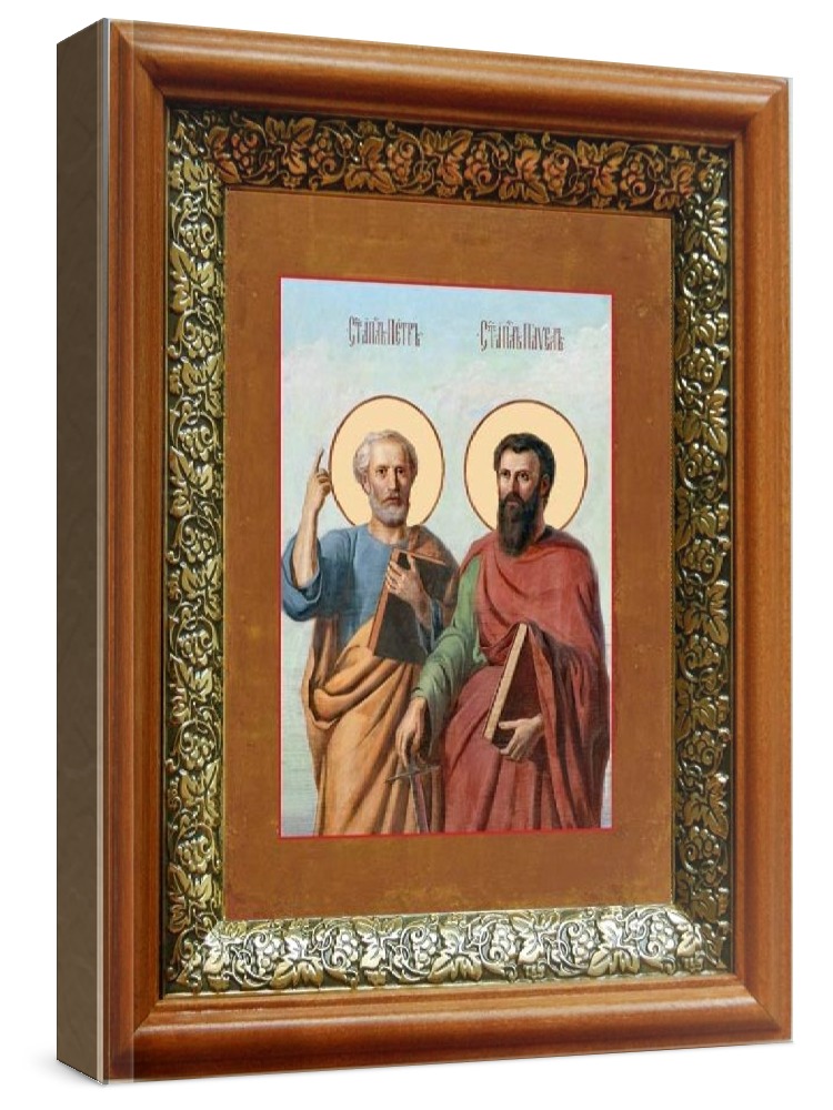 Икона петр и павел (19х22), светлый киот. Лик нанесен методом объемного тиснения фолиевыми красками по золотой фольге, что гарантирует максимально долгую сохранность яркости изображения. Полный размер иконы с киотом: 19x22 см. Икона под стеклом. Киот (рамка) изготовлен из березы и украшен басмой (узор из черненой меди в виде виноградной лозы).