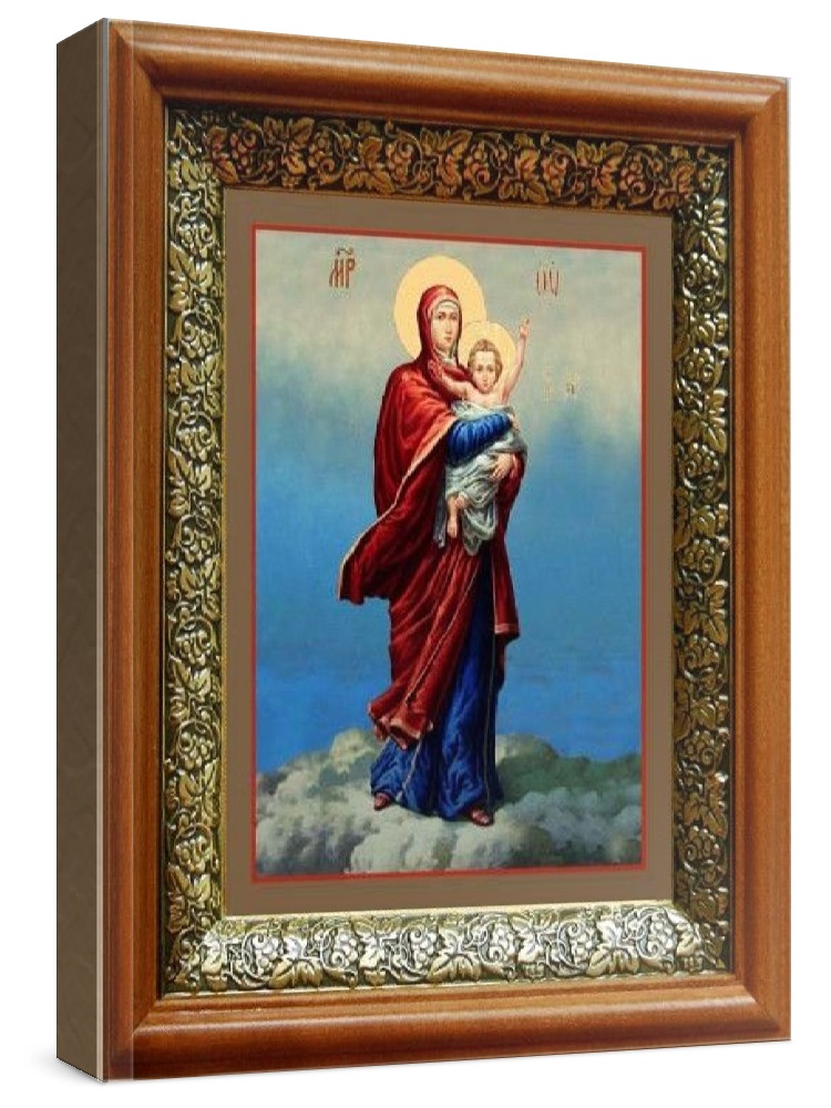 Икона благодатное небо (19х22), светлый киот. Лик нанесен методом шелкографии на цельную липовую доску, покрытую левкасом (специальным грунтом под живопись). Использованы минеральные (природные) краски. Размер иконы без киота (см): 13х16, с киотом: 19х22. Киот (рамка) выполнен из березы и украшен басмой (узор из черненой меди в виде виноградной лозы). Икона освящена.