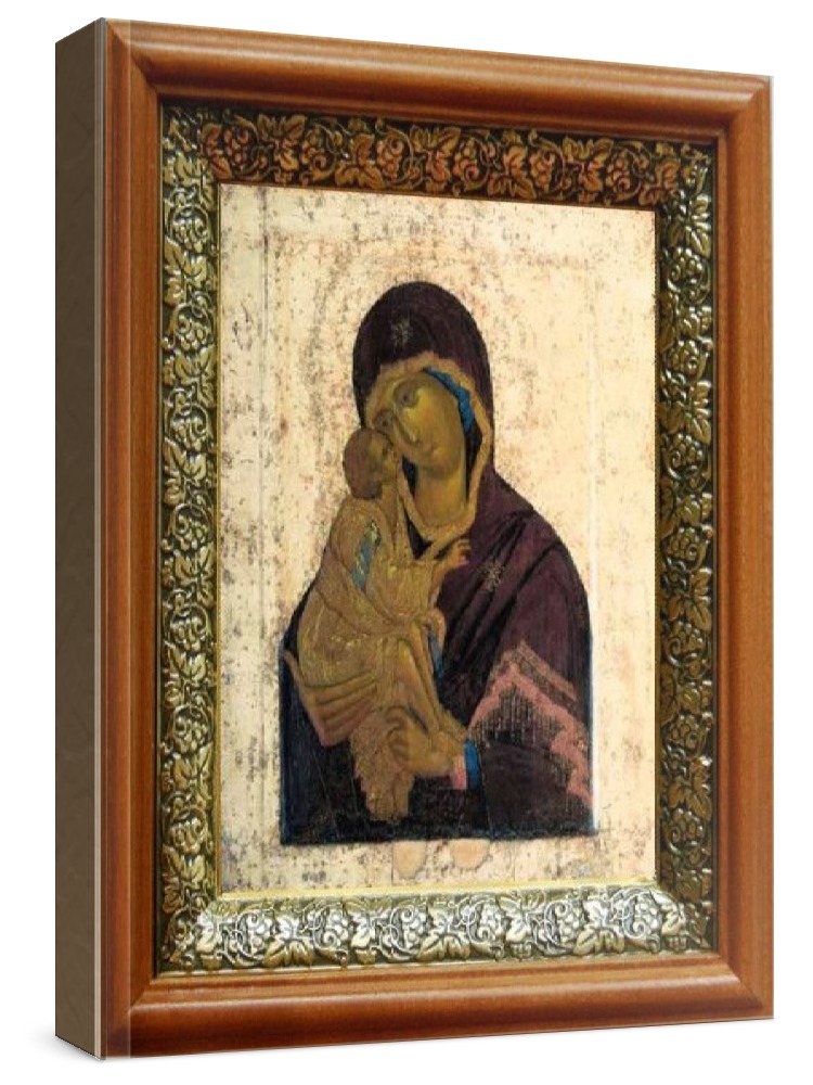 Лик нанесен методом шелкографии на цельную липовую доску, покрытую левкасом (специальным грунтом под живопись). Использованы минеральные (природные) краски. Размер иконы без киота (см): 13х16, с киотом: 19х22. Киот (рамка) выполнен из березы и украшен басмой (узор из черненой меди в виде виноградной лозы). Икона освящена.