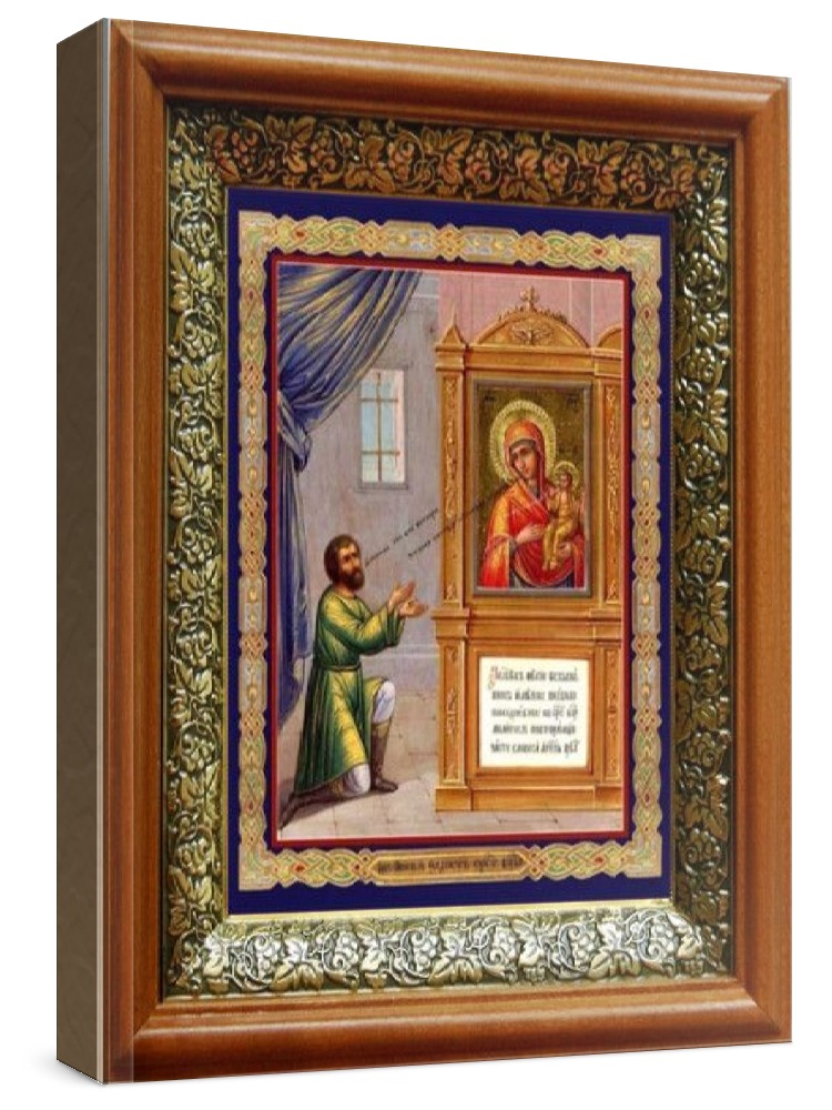 Икона нечаянная радость (19х22), светлый киот. Лик нанесен методом шелкографии на цельную липовую доску, покрытую левкасом (специальным грунтом под живопись). Использованы минеральные (природные) краски. Размер иконы без киота (см): 13х16, с киотом: 19х22. Киот (рамка) выполнен из березы и украшен басмой (узор из черненой меди в виде виноградной лозы). Икона освящена.