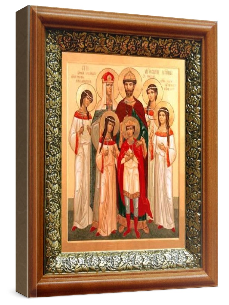 Икона царская семья (19х22), светлый киот. Лик нанесен методом шелкографии на цельную липовую доску, покрытую левкасом (специальным грунтом под живопись). Использованы минеральные (природные) краски. Размер иконы без киота (см): 13х16, с киотом: 19х22. Киот (рамка) выполнен из березы и украшен басмой (узор из черненой меди в виде виноградной лозы). Икона освящена.