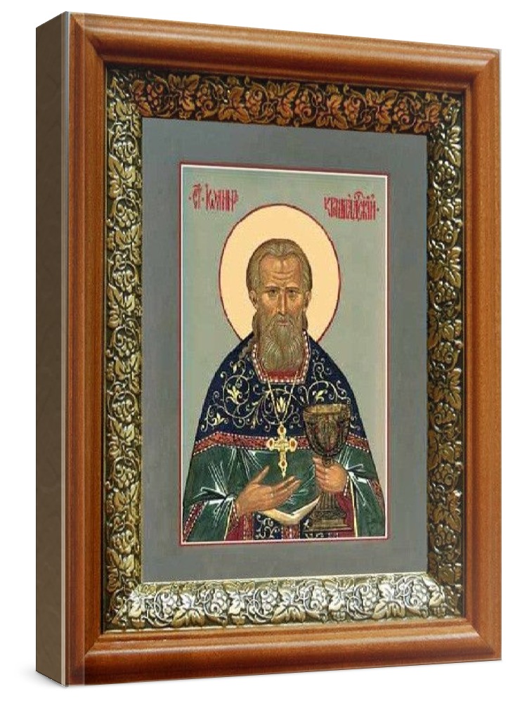 Икона иоанн кронштадтский (19х22), светлый киот. Лик нанесен методом шелкографии на цельную липовую доску, покрытую левкасом (специальным грунтом под живопись). Использованы минеральные (природные) краски. Размер иконы без киота (см): 13х16, с киотом: 19х22. Киот (рамка) выполнен из березы и украшен басмой (узор из черненой меди в виде виноградной лозы). Икона освящена.