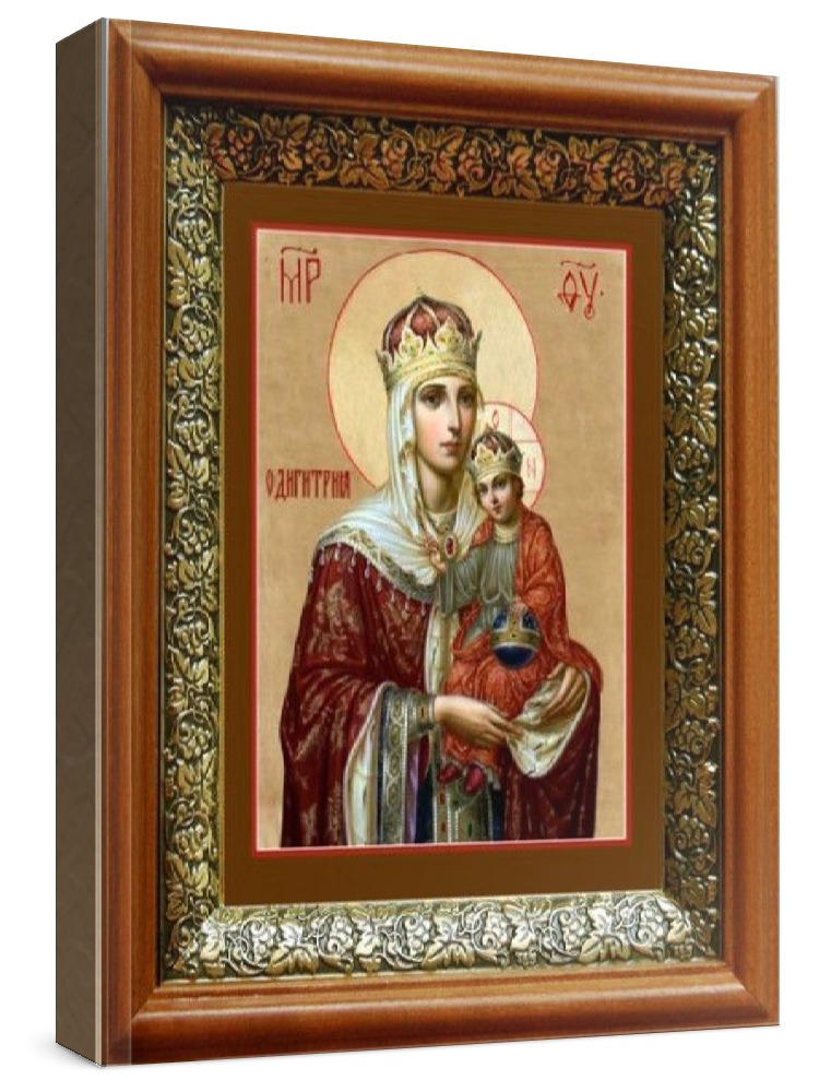 Икона одигитрия (19х22), светлый киот. Лик нанесен методом шелкографии на цельную липовую доску, покрытую левкасом (специальным грунтом под живопись). Использованы минеральные (природные) краски. Размер иконы без киота (см): 13х16, с киотом: 19х22. Киот (рамка) выполнен из березы и украшен басмой (узор из черненой меди в виде виноградной лозы). Икона освящена.