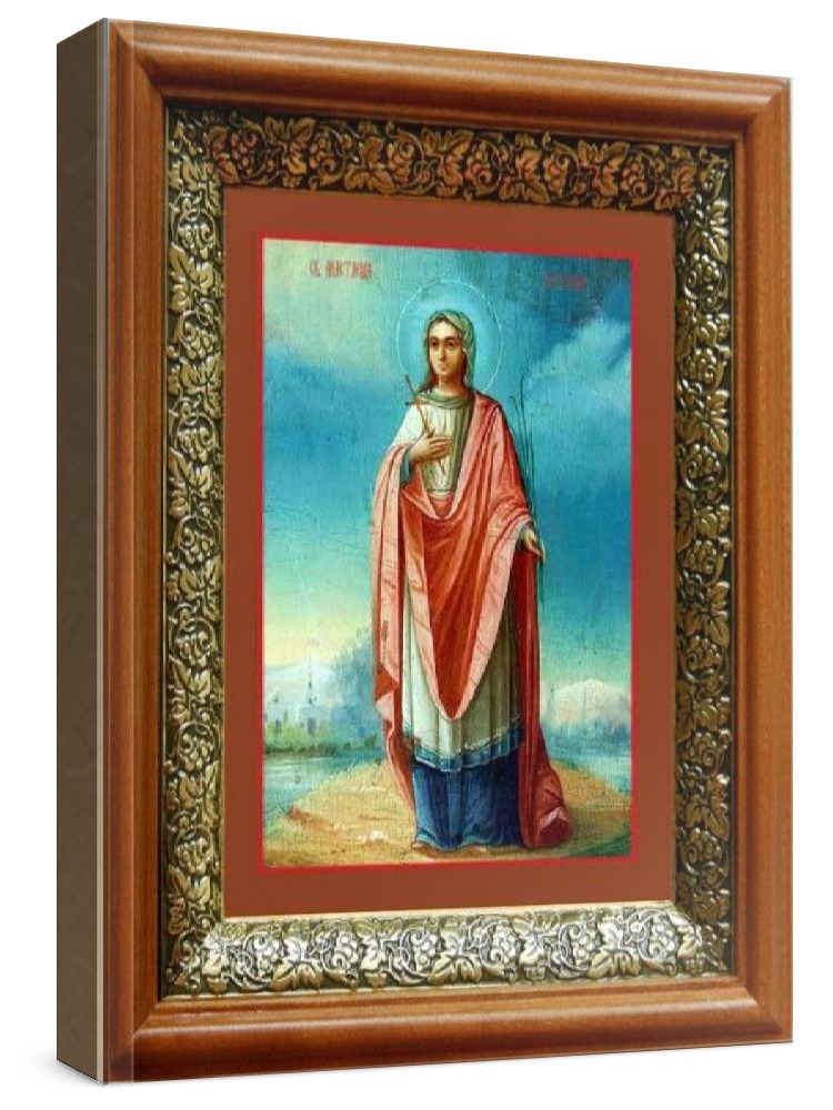 Икона анастасия патрикия (19х22), светлый киот. Лик нанесен методом шелкографии на цельную липовую доску, покрытую левкасом (специальным грунтом под живопись). Использованы минеральные (природные) краски. Размер иконы без киота (см): 13х16, с киотом: 19х22. Киот (рамка) выполнен из березы и украшен басмой (узор из черненой меди в виде виноградной лозы). Икона освящена.
