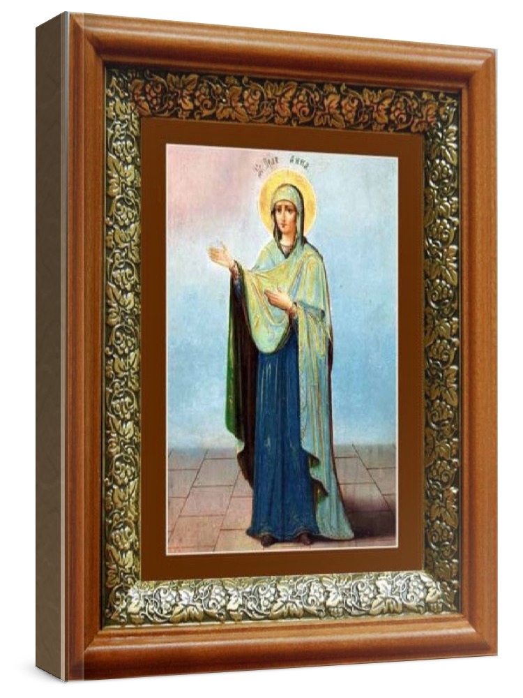 Икона анна пророчица (19х22), светлый киот. Лик нанесен методом шелкографии на цельную липовую доску, покрытую левкасом (специальным грунтом под живопись). Использованы минеральные (природные) краски. Размер иконы без киота (см): 13х16, с киотом: 19х22. Киот (рамка) выполнен из березы и украшен басмой (узор из черненой меди в виде виноградной лозы). Икона освящена.
