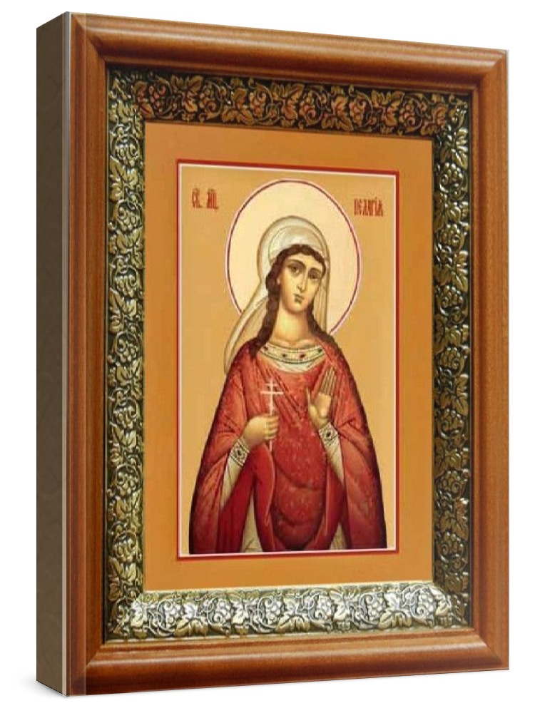 Икона пелагея тарсийская (19х22), светлый киот. Лик нанесен методом шелкографии на цельную липовую доску, покрытую левкасом (специальным грунтом под живопись). Использованы минеральные (природные) краски. Размер иконы без киота (см): 13х16, с киотом: 19х22. Киот (рамка) выполнен из березы и украшен басмой (узор из черненой меди в виде виноградной лозы). Икона освящена.