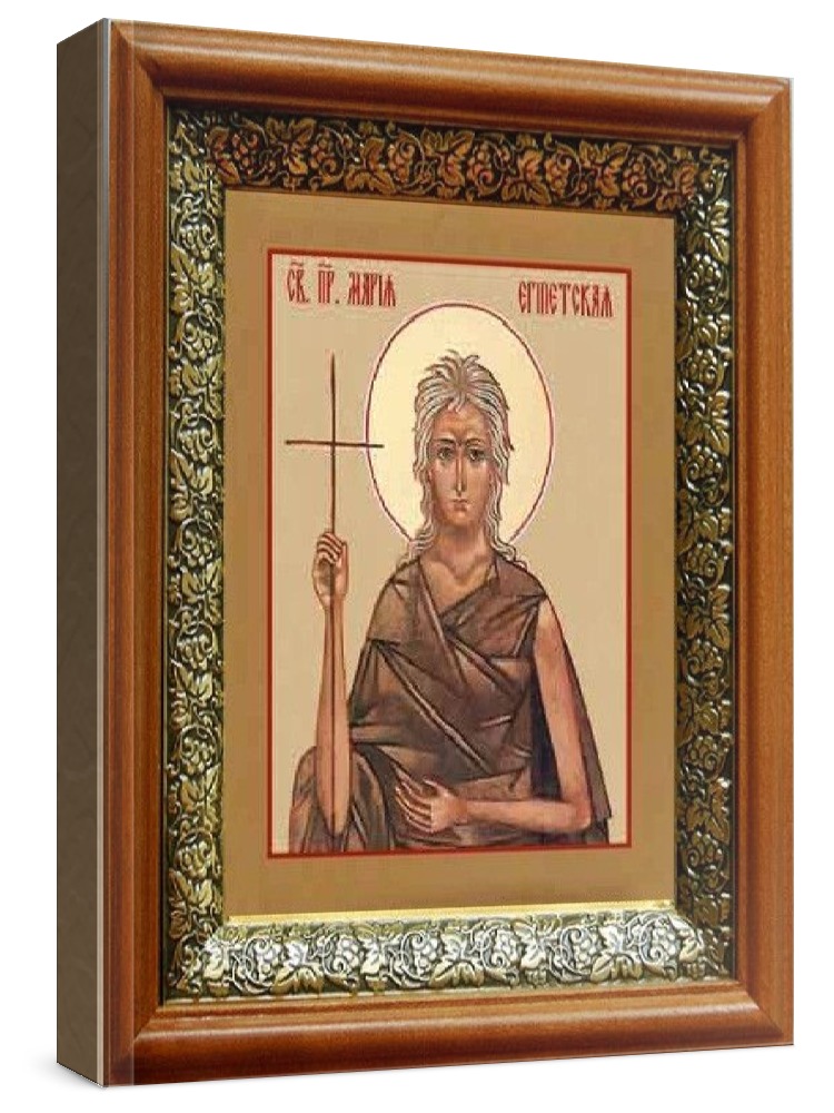 Икона мария египетская (19х22), светлый киот. Лик нанесен методом шелкографии на цельную липовую доску, покрытую левкасом (специальным грунтом под живопись). Использованы минеральные (природные) краски. Размер иконы без киота (см): 13х16, с киотом: 19х22. Киот (рамка) выполнен из березы и украшен басмой (узор из черненой меди в виде виноградной лозы). Икона освящена.