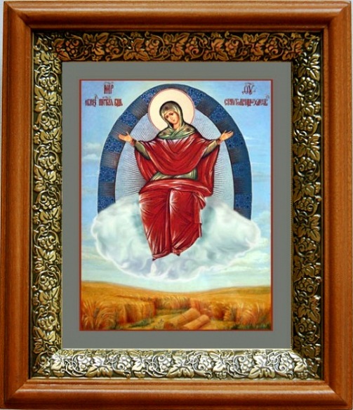 Икона спорительница хлебов (19х22), светлый киот. Лик нанесен методом шелкографии на цельную липовую доску, покрытую левкасом (специальным грунтом под живопись). Использованы минеральные (природные) краски. Размер иконы без киота (см): 13х16, с киотом: 19х22. Киот (рамка) выполнен из березы и украшен басмой (узор из черненой меди в виде виноградной лозы). Икона освящена.