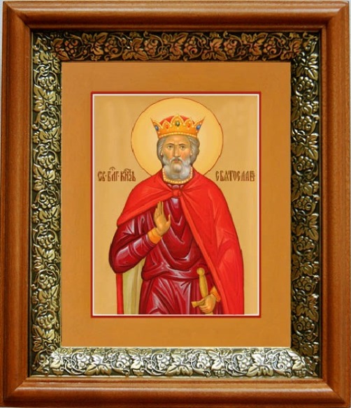 Икона святослав (19х22), светлый киот. Лик нанесен методом шелкографии на цельную липовую доску, покрытую левкасом (специальным грунтом под живопись). Использованы минеральные (природные) краски. Размер иконы без киота (см): 13х16, с киотом: 19х22. Киот (рамка) выполнен из березы и украшен басмой (узор из черненой меди в виде виноградной лозы). Икона освящена.