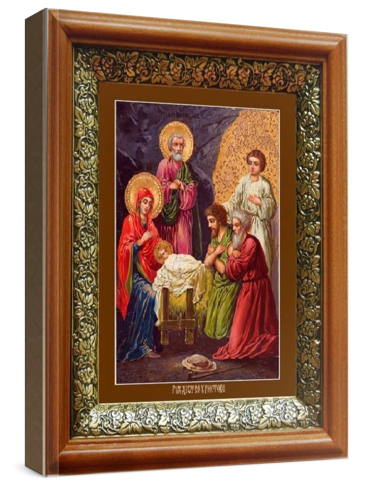 Икона рождество христово (19х22), светлый киот. Лик нанесен методом объемного тиснения фолиевыми красками по золотой фольге, что гарантирует максимально долгую сохранность яркости изображения. Полный размер иконы с киотом: 19x22 см. Икона под стеклом. Киот (рамка) изготовлен из березы и украшен басмой (узор из черненой меди в виде виноградной лозы).
