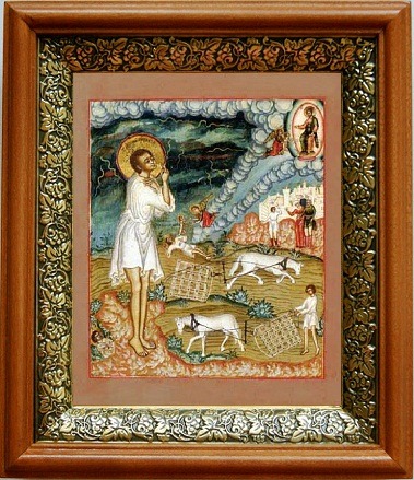 Икона артемий веркольский (19х22), светлый киот. Лик нанесен методом шелкографии на цельную липовую доску, покрытую левкасом (специальным грунтом под живопись). Использованы минеральные (природные) краски. Размер иконы без киота (см): 13х16, с киотом: 19х22. Киот (рамка) выполнен из березы и украшен басмой (узор из черненой меди в виде виноградной лозы). Икона освящена.