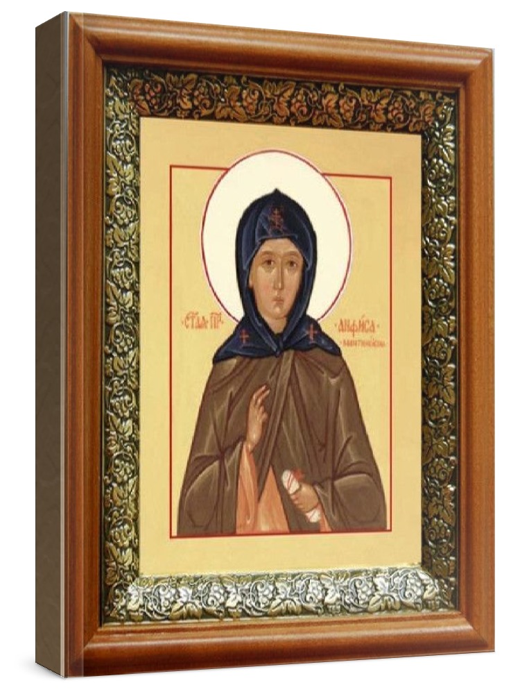 Икона анфиса мантинейская (19х22), светлый киот. Лик нанесен методом шелкографии на цельную липовую доску, покрытую левкасом (специальным грунтом под живопись). Использованы минеральные (природные) краски. Размер иконы без киота (см): 13х16, с киотом: 19х22. Киот (рамка) выполнен из березы и украшен басмой (узор из черненой меди в виде виноградной лозы). Икона освящена.
