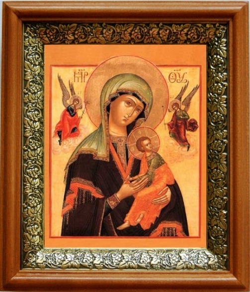 Страстная икона бм (19х22), светлый киот. Лик нанесен методом шелкографии на цельную липовую доску, покрытую левкасом (специальным грунтом под живопись). Использованы минеральные (природные) краски. Размер иконы без киота (см): 13х16, с киотом: 19х22. Киот (рамка) выполнен из березы и украшен басмой (узор из черненой меди в виде виноградной лозы). Икона освящена.