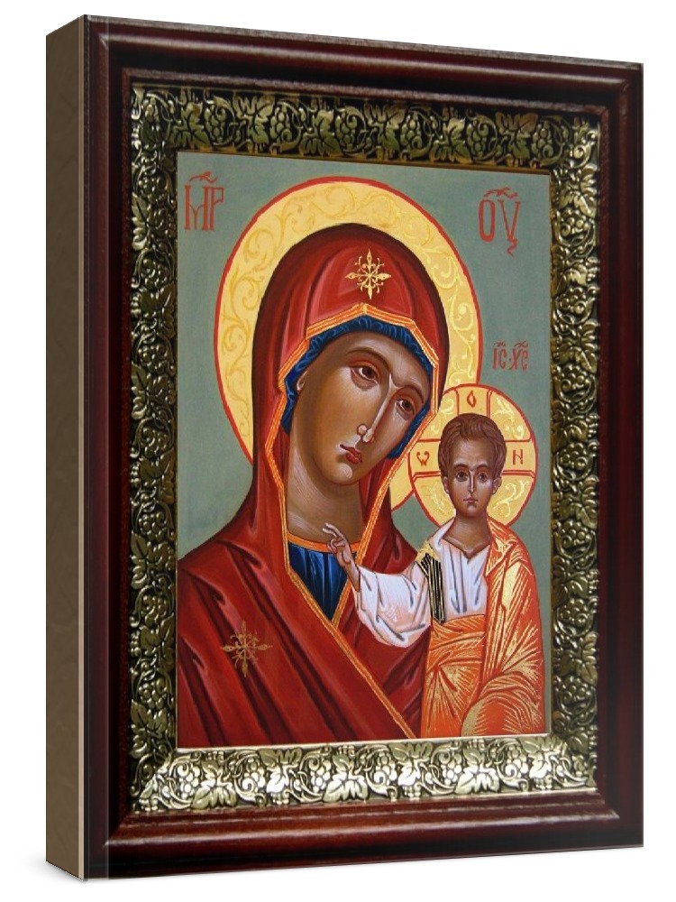 Казанская икона бм (19х22), темный киот. Икона выполняется на заказ. Срок изготовления - 5-10 дней. Лик нанесен методом шелкографии на цельную липовую доску, покрытую левкасом (специальным грунтом под живопись). Использованы минеральные (природные) краски. Размер иконы без киота (см): 13х16, с киотом: 19х22. Киот (рамка) выполнен из березы и украшен басмой (узор из черненой меди в виде виноградной лозы). Икона освящена.