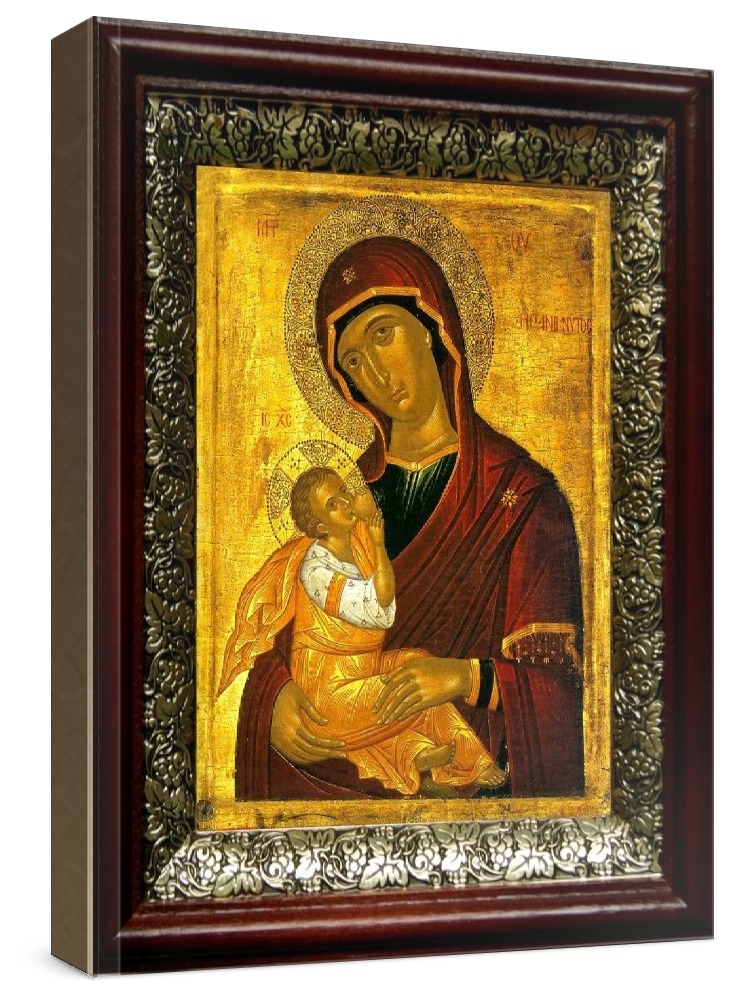 Икона млекопитательница (19х22), темный киот. Икона выполняется на заказ. Срок изготовления - 5-10 дней. Лик нанесен методом шелкографии на цельную липовую доску, покрытую левкасом (специальным грунтом под живопись). Использованы минеральные (природные) краски. Размер иконы без киота (см): 13х16, с киотом: 19х22. Киот (рамка) выполнен из березы и украшен басмой (узор из черненой меди в виде виноградной лозы). Икона освящена.