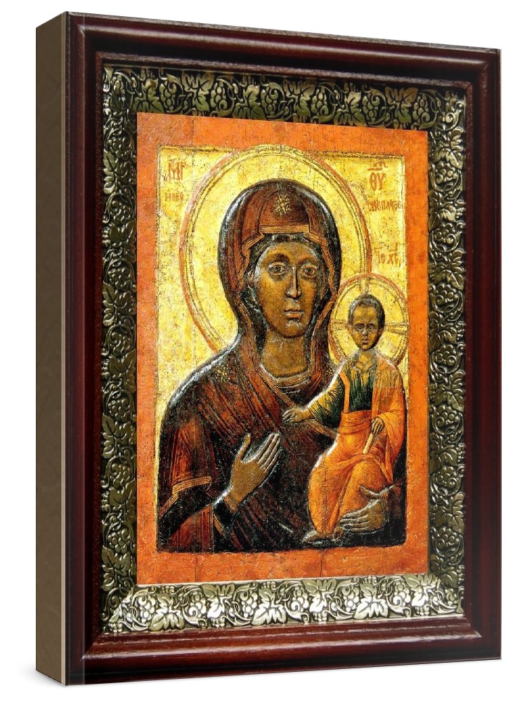 Влахернская икона бм (19х22), темный киот. Икона выполняется на заказ. Срок изготовления - 3-7 дней. Лик нанесен методом шелкографии на цельную липовую доску, покрытую левкасом (специальным грунтом под живопись). Использованы минеральные (природные) краски. Размер иконы без киота (см): 13х16, с киотом: 19х22. Киот (рамка) выполнен из березы и украшен басмой (узор из черненой меди в виде лозы). Икона освящена.