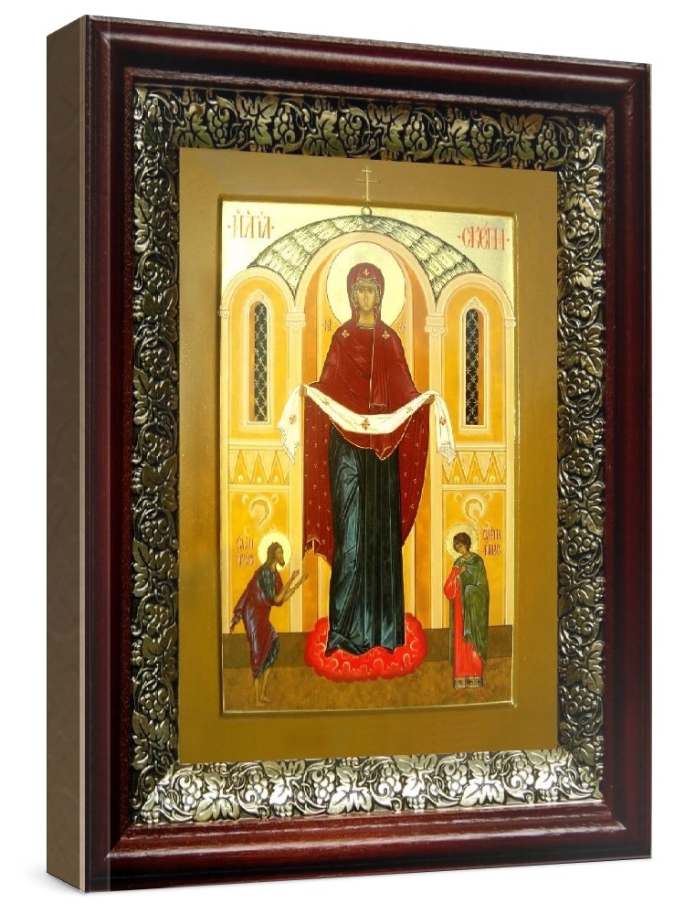 Икона покров пресвятой богородицы (19х22), темный киот. Икона выполняется на заказ. Срок изготовления - 3-7 дней. Лик нанесен методом шелкографии на цельную липовую доску, покрытую левкасом (специальным грунтом под живопись). Использованы минеральные (природные) краски. Размер иконы без киота (см): 13х16, с киотом: 19х22. Киот (рамка) выполнен из березы и украшен басмой (узор из черненой меди в виде виноградной лозы). Икона освящена.