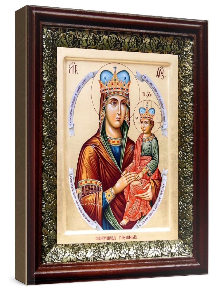 Икона споручница грешных (19х22), темный киот. Икона выполняется на заказ. Срок изготовления - 3-7 дней. Лик нанесен методом шелкографии на цельную липовую доску, покрытую левкасом (специальным грунтом под живопись). Использованы минеральные (природные) краски. Размер иконы без киота (см): 13х16, с киотом: 19х22. Киот (рамка) выполнен из березы и украшен басмой (узор из черненой меди в виде виноградной лозы). Икона освящена.