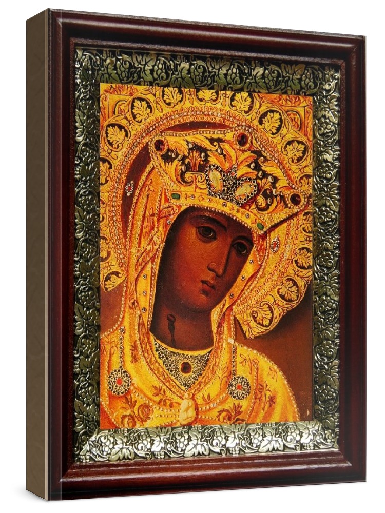 Андрониковская икона бм (19х22), темный киот. Икона выполняется на заказ. Срок изготовления - 2-5 дней. Лик нанесен методом шелкографии на цельную липовую доску, покрытую левкасом (специальным грунтом под живопись). Использованы минеральные (природные) краски. Размер иконы без киота (см): 13х16, с киотом: 19х22. Киот (рамка) выполнен из березы и украшен басмой (узор из черненой меди в виде виноградной лозы). Икона освящена.