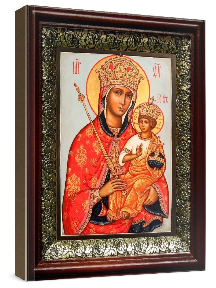 Галатская икона бм (19х22), темный киот. Икона выполняется на заказ. Срок изготовления - 2-5 дней. Лик нанесен методом шелкографии на цельную липовую доску, покрытую левкасом (специальным грунтом под живопись). Использованы минеральные (природные) краски. Размер иконы без киота (см): 13х16, с киотом: 19х22. Киот (рамка) выполнен из березы и украшен басмой (узор из черненой меди в виде виноградной лозы). Икона освящена.