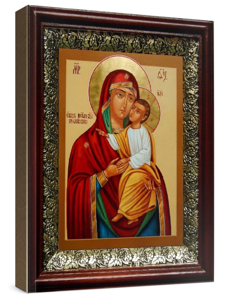 Пряжевская икона бм (19х22), темный киот. Икона выполняется на заказ. Срок изготовления - 2-5 дней. Лик нанесен методом шелкографии на цельную липовую доску, покрытую левкасом (специальным грунтом под живопись). Использованы минеральные (природные) краски. Размер иконы без киота (см): 13х16, с киотом: 19х22. Киот (рамка) выполнен из березы и украшен басмой (узор из черненой меди в виде виноградной лозы). Икона освящена.