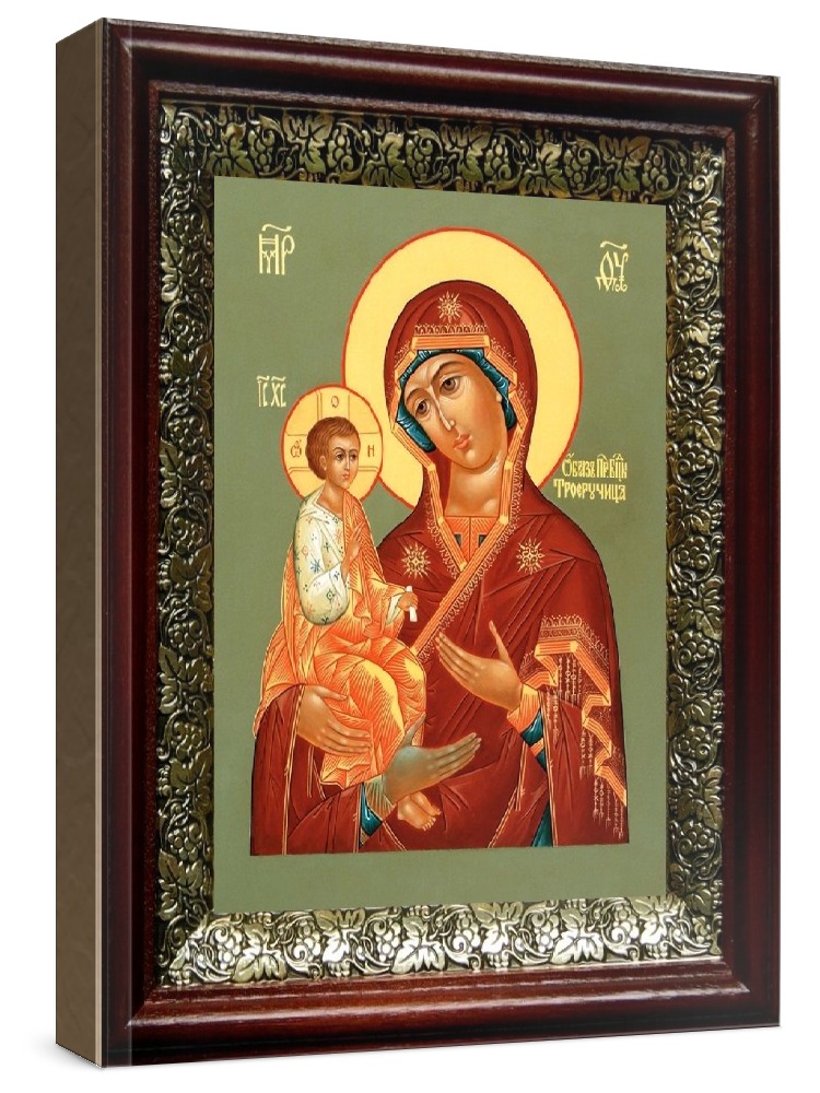 Икона троеручица (19х22), темный киот. Икона выполняется на заказ. Срок изготовления - 2-5 дней. Лик нанесен методом шелкографии на цельную липовую доску, покрытую левкасом (специальным грунтом под живопись). Использованы минеральные (природные) краски. Размер иконы без киота (см): 13х16, с киотом: 19х22. Киот (рамка) выполнен из березы и украшен басмой (узор из черненой меди в виде виноградной лозы). Икона освящена.
