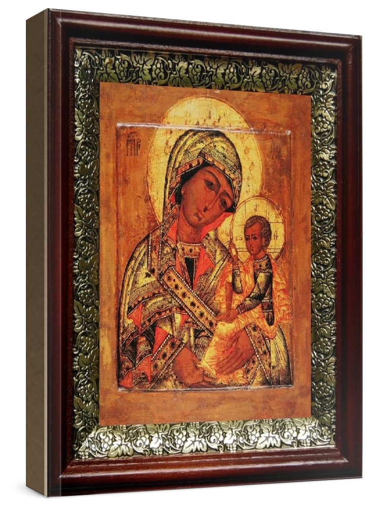 Икона шуйская смоленская (19х22), темный киот. Икона выполняется на заказ. Срок изготовления - 2-5 дней. Лик нанесен методом шелкографии на цельную липовую доску, покрытую левкасом (специальным грунтом под живопись). Использованы минеральные (природные) краски. Размер иконы без киота (см): 13х16, с киотом: 19х22. Киот (рамка) выполнен из березы и украшен басмой (узор из черненой меди в виде виноградной лозы). Икона освящена.