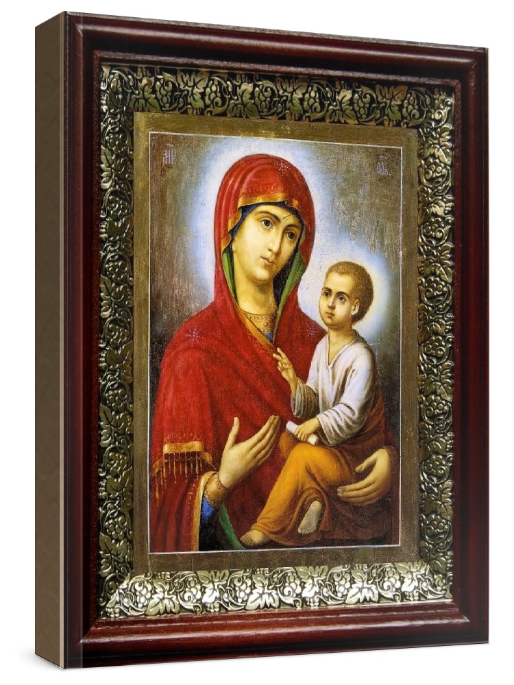 Тихвинская икона бм (19х22), темный киот. Икона выполняется на заказ. Срок изготовления - 2-5 дней. Лик нанесен методом шелкографии на цельную липовую доску, покрытую левкасом (специальным грунтом под живопись). Использованы минеральные (природные) краски. Размер иконы без киота (см): 13х16, с киотом: 19х22. Киот (рамка) выполнен из березы и украшен басмой (узор из черненой меди в виде виноградной лозы). Икона освящена.