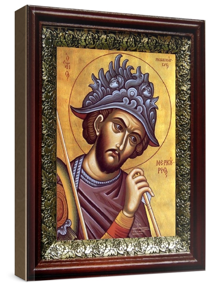 Икона меркурий кесарийский (19х22), темный киот. Икона выполняется на заказ. Срок изготовления - 2-5 дней. Лик нанесен методом шелкографии на цельную липовую доску, покрытую левкасом (специальным грунтом под живопись). Использованы минеральные (природные) краски. Размер иконы без киота (см): 13х16, с киотом: 19х22. Киот (рамка) выполнен из березы и украшен басмой (узор из черненой меди в виде виноградной лозы). Икона освящена.