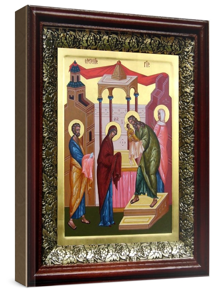 Икона сретение господне (19х22), темный киот. Икона выполняется на заказ. Срок изготовления - 2-5 дней. Лик нанесен методом шелкографии на цельную липовую доску, покрытую левкасом (специальным грунтом под живопись). Использованы минеральные (природные) краски. Размер иконы без киота (см): 13х16, с киотом: 19х22. Киот (рамка) выполнен из березы и украшен басмой (узор из черненой меди в виде виноградной лозы). Икона освящена.