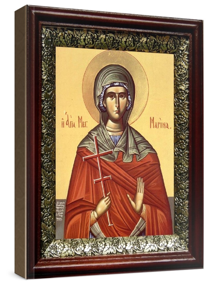 Икона марина антиохийская (19х22), темный киот. Икона выполняется на заказ. Срок изготовления - 2-5 дней. Лик нанесен методом шелкографии на цельную липовую доску, покрытую левкасом (специальным грунтом под живопись). Использованы минеральные (природные) краски. Размер иконы без киота (см): 13х16, с киотом: 19х22. Киот (рамка) выполнен из березы и украшен басмой (узор из черненой меди в виде виноградной лозы). Икона освящена.