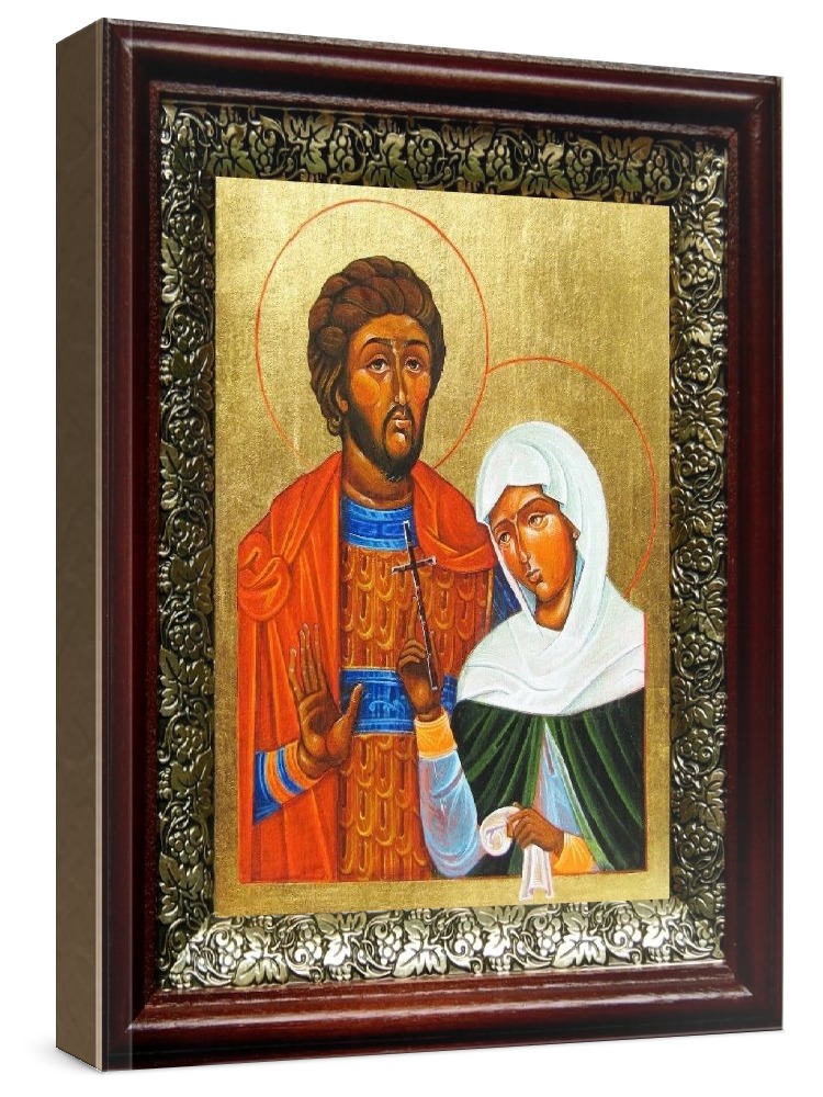 Икона адриан и наталия (19х22), темный киот. Икона выполняется на заказ. Срок изготовления - 2-5 дней. Лик нанесен методом шелкографии на цельную липовую доску, покрытую левкасом (специальным грунтом под живопись). Использованы минеральные (природные) краски. Размер иконы без киота (см): 13х16, с киотом: 19х22. Киот (рамка) выполнен из березы и украшен басмой (узор из черненой меди в виде виноградной лозы). Икона освящена.