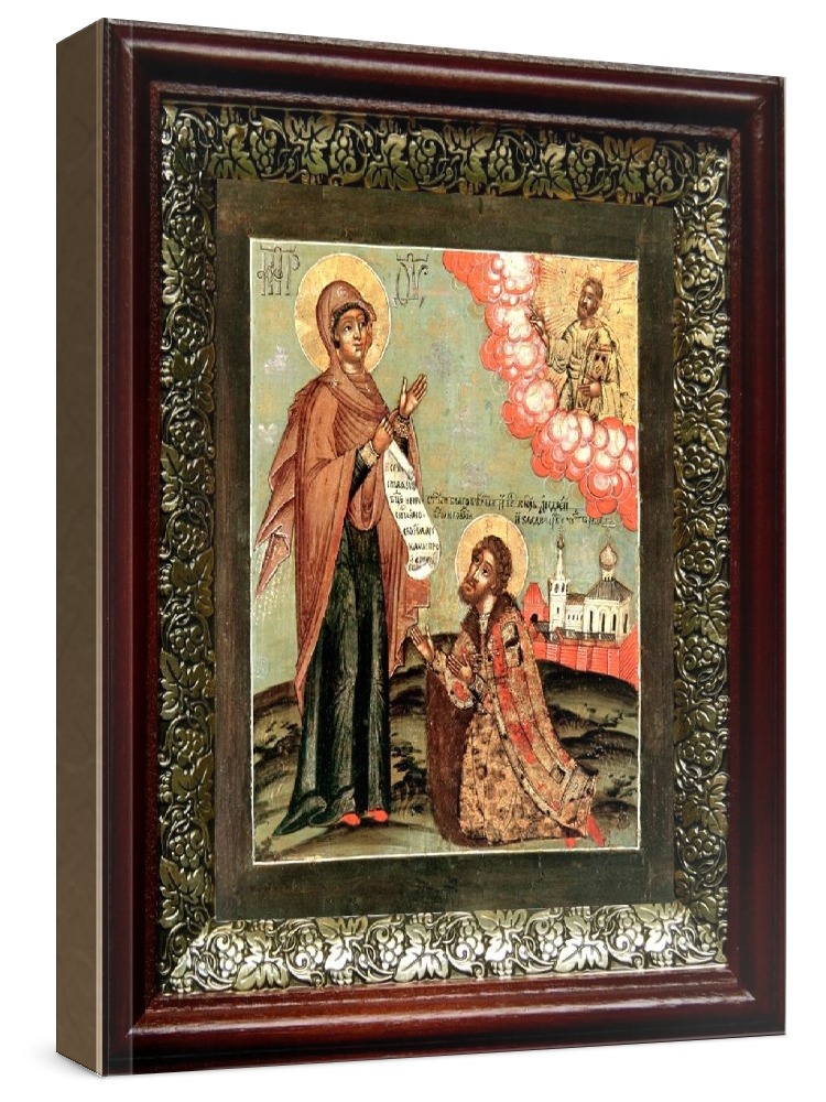 Икона явление богородицы андрею боголюбскому (19х22), темный киот. Лик нанесен методом шелкографии на цельную липовую доску, покрытую левкасом (специальным грунтом под живопись). Использованы минеральные (природные) краски. Размер иконы без киота (см): 13х16, с киотом: 19х22. Киот со стеклом, выполнен из березы и украшен басмой (узор из черненой меди в виде виноградной лозы). Икона освящена.