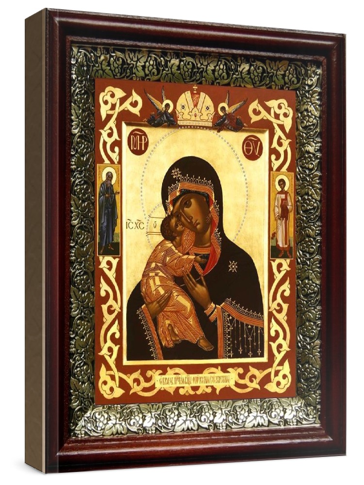 Икона умиление себежская опочецкая (19х22), темный киот. Лик нанесен методом шелкографии на цельную липовую доску, покрытую левкасом (специальным грунтом под живопись). Использованы минеральные (природные) краски. Размер иконы без киота (см): 13х16, с киотом: 19х22. Киот со стеклом, выполнен из березы и украшен басмой (узор из черненой меди в виде виноградной лозы). Икона освящена.