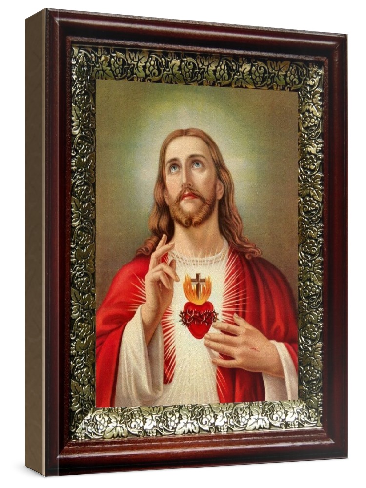 Икона сердце иисуса христа (19х22), темный киот. Лик нанесен методом шелкографии на цельную липовую доску, покрытую левкасом (специальным грунтом под живопись). Использованы минеральные (природные) краски. Размер иконы без киота (см): 13х16, с киотом: 19х22. Киот со стеклом, выполнен из березы и украшен басмой (узор из черненой меди в виде виноградной лозы). Икона освящена.