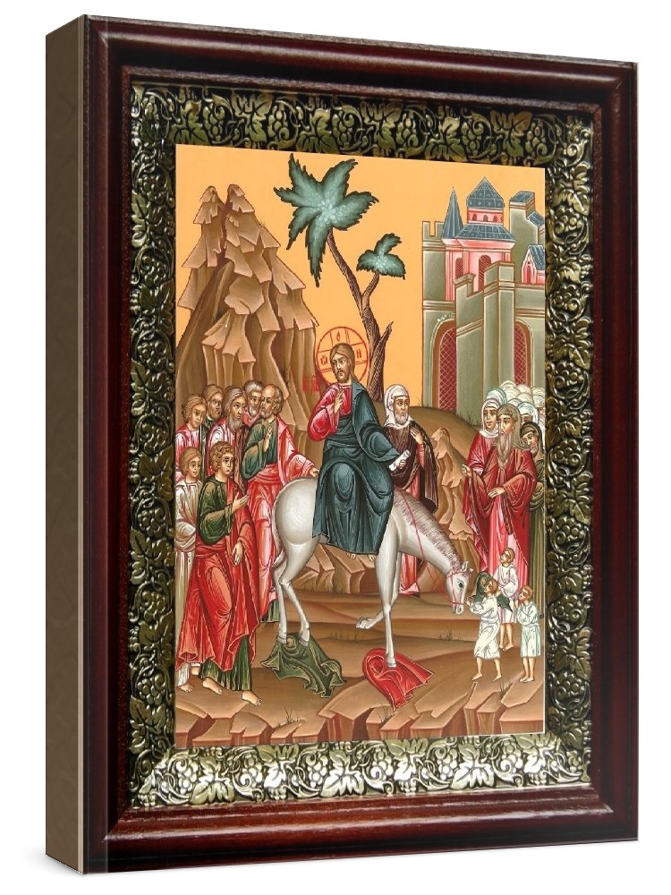 Икона вход господень в иерусалим (19х22), темный киот. Лик нанесен методом шелкографии на цельную липовую доску, покрытую левкасом (специальным грунтом под живопись). Использованы минеральные (природные) краски. Размер иконы без киота (см): 13х16, с киотом: 19х22. Киот со стеклом, выполнен из березы и украшен басмой (узор из черненой меди в виде виноградной лозы). Икона освящена.