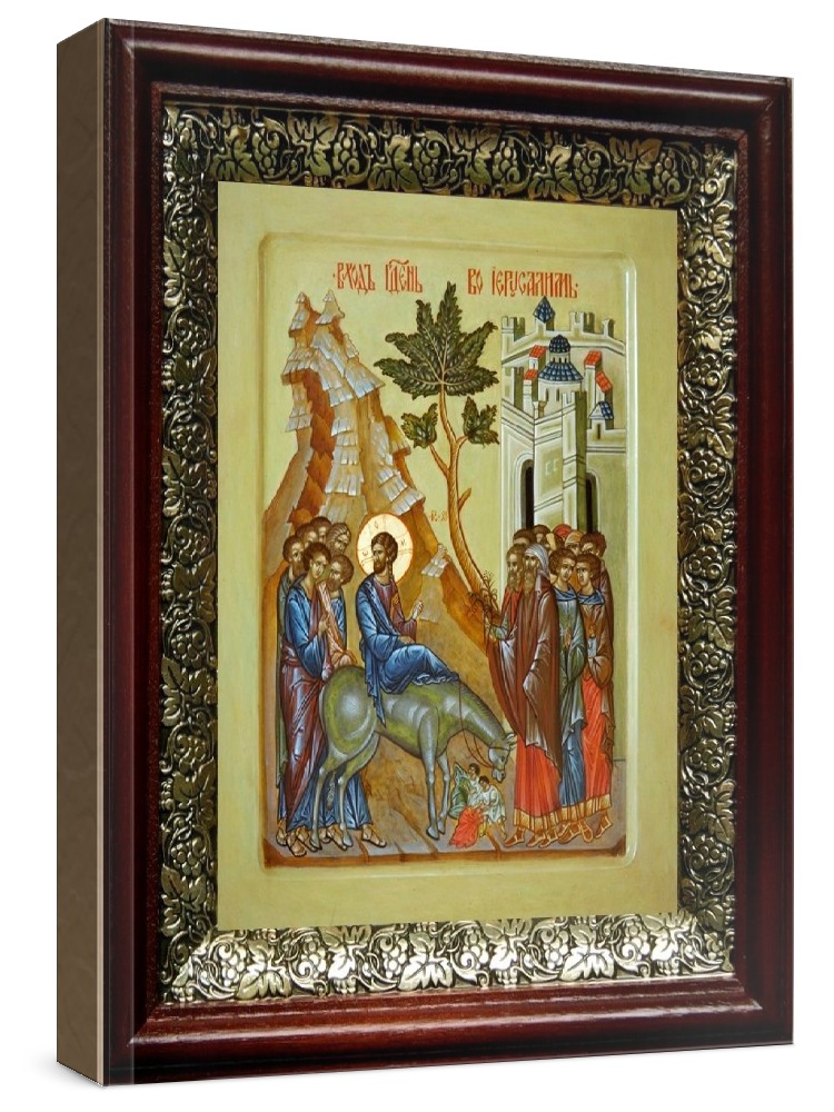 Икона вход господень в иерусалим (19х22), темный киот. Лик нанесен методом шелкографии на цельную липовую доску, покрытую левкасом (специальным грунтом под живопись). Использованы минеральные (природные) краски. Размер иконы без киота (см): 13х16, с киотом: 19х22. Киот со стеклом, выполнен из березы и украшен басмой (узор из черненой меди в виде виноградной лозы). Икона освящена.