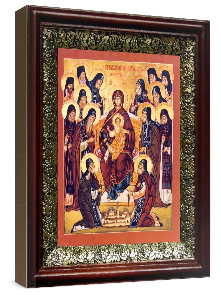 Икона оптинские старцы (19х22), темный киот. Лик нанесен методом шелкографии на цельную липовую доску, покрытую левкасом (специальным грунтом под живопись). Использованы минеральные (природные) краски. Размер иконы без киота (см): 13х16, с киотом: 19х22. Киот со стеклом, выполнен из березы и украшен басмой (узор из черненой меди в виде виноградной лозы). Икона освящена.