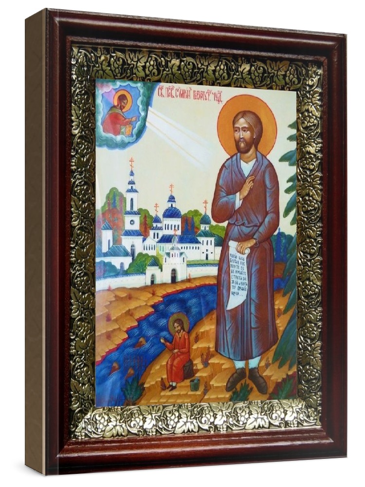 Икона симеон верхотурский (19х22), темный киот. Лик нанесен методом шелкографии на цельную липовую доску, покрытую левкасом (специальным грунтом под живопись). Использованы минеральные (природные) краски. Размер иконы без киота (см): 13х16, с киотом: 19х22. Киот со стеклом, выполнен из березы и украшен басмой (узор из черненой меди в виде виноградной лозы). Икона освящена.