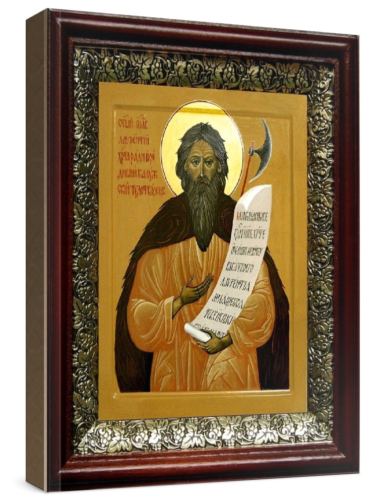 Икона лаврентий калужский (19х22), темный киот. Лик нанесен методом шелкографии на цельную липовую доску, покрытую левкасом (специальным грунтом под живопись). Использованы минеральные (природные) краски. Размер иконы без киота (см): 13х16, с киотом: 19х22. Киот со стеклом, выполнен из березы и украшен басмой (узор из черненой меди в виде виноградной лозы). Икона освящена.