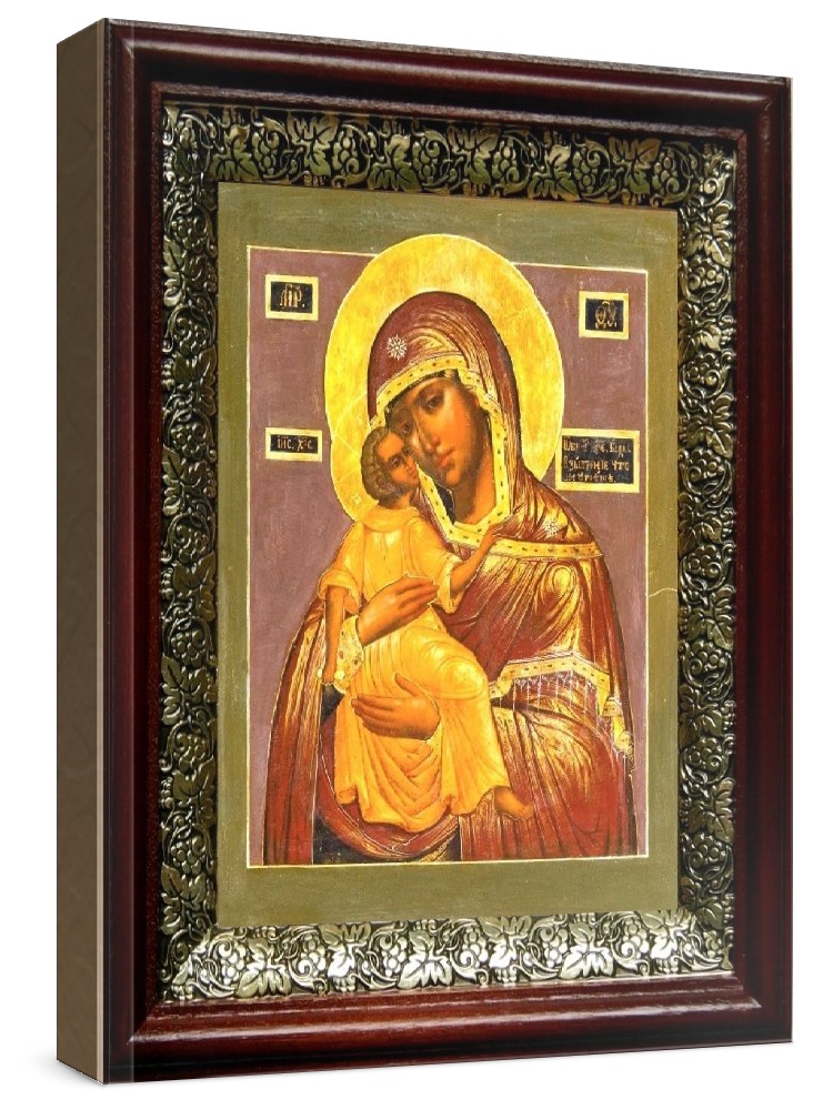 Икона взыграние младенца (19х22), темный киот. Лик нанесен методом шелкографии на цельную липовую доску, покрытую левкасом (специальным грунтом под живопись). Использованы минеральные (природные) краски. Размер иконы без киота (см): 13х16, с киотом: 19х22. Киот (рамка) выполнен из березы и украшен басмой (узор из черненой меди в виде виноградной лозы). Икона освящена.
